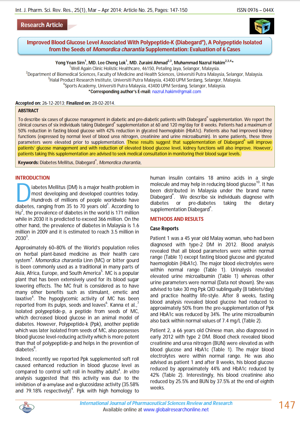 Improved Blood Glucose Level Associated with Polypeptide-k (Diabegard)