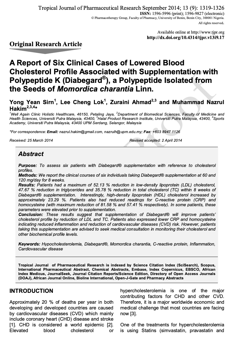 Polypeptide-k Lowered Blood Cholesterol (Diabegard)